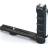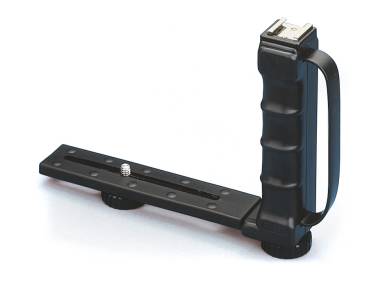 Zusammenlegbar. Handgriff mit Schlaufe. Klappbare Kameraschiene aus Leichtmetall mit elastischer Auflagefläche. Befestigungsschraube mit Gewindezapfen B 1/4 und Stativgewinde A 1/4.