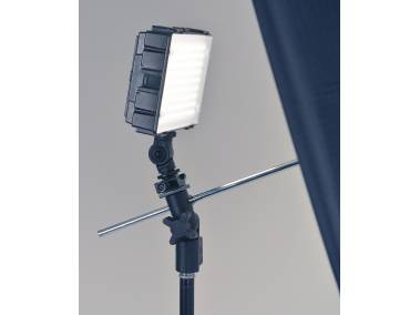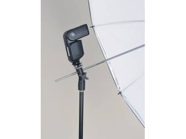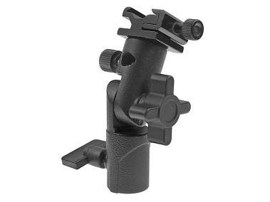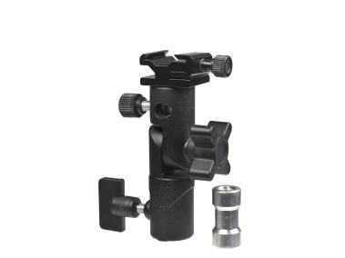 Metallgelenk zur Klemmbefestigung von Aufsteckblitzgeräten, Leuchten und Zubehör mit Standard-ISO-Aufsteckfuß auf Stativen und Halterungen mit 16 mm-Normzapfen oder mittels mitgeliefertem Adapter an Anschlussgewinden 1/4" oder 3/8".