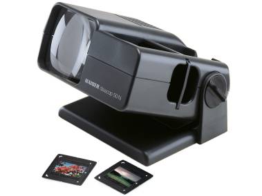 Dia-Betrachter mit 3-fach vergrößernder Doppellinse für gerahmte Dias 5 x 5 cm und ungeschnittene Filmstreifen, Wechselschieber für komfortablen Diawechsel ohne störende Hellphase, Fallschacht für bis zu 40 Dias. Schwenkbares Oberteil zur Einstellung des gewünschten Betrachtungswinkels, Netzbetrieb.
