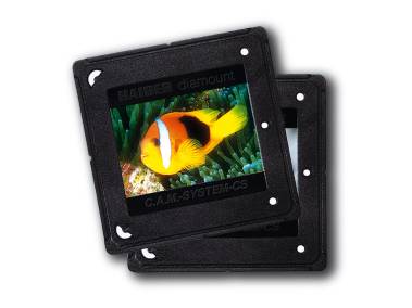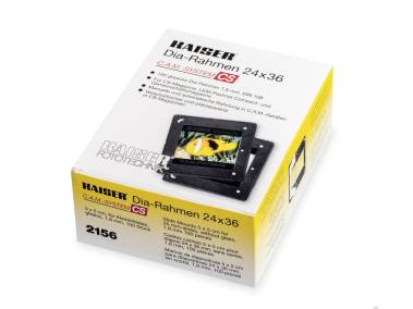 Einteiliges glasloses Klapprähmchen 5 x 5 cm nach DIN 108 für Kleinbilddias (24x36 mm). Zur automatischen Rahmung mit Kaiser diamount C.A.M./CS-Schneide- und Rahmungsgeräten, dem Reflecta Servicemaster CS 2 und dem Braun Paximat Automount. Auch für Handrahmung.