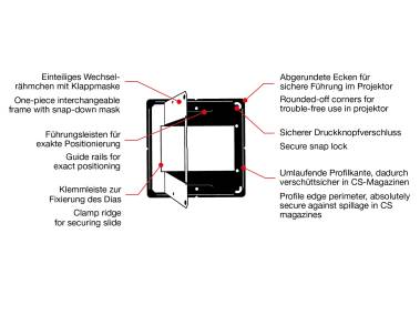 Klemmleiste zur Fixierung des Dias und für passgenauen Sitz. Führungsleisten zur exakten Positionierung des Dias beim automatischen Rahmen. Rahmenstärke 1,8 mm. Für CS-Magazine, LKM-, Paximat Compact- und Gemeinschaftsmagazine.