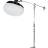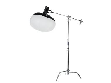 Scheinwerfer schwenkbar auf Montagebügel aus Aluminium. Befestigung auf geeigneten Stativen/Halterungen mit 16 mm (5/8“)-Normzapfen. Integrierter Schirmhalter.