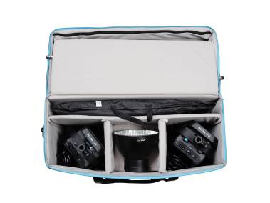 Transportables Studio-Beleuchtungssystem für Foto- und Videoaufnahmen. Besonders geeignet für Cine/Broadcast, Virtual Production, Werbe-, Porträt- und Produktaufnahmen, Interview, Videokonferenzen, Streaming sowie Livestream, Social Media-Aktivitäten, Vlogging und Webinare. Bestehend aus zwei Weißlicht-Scheinwerfern FS-300B Bi-Color, zwei Reflektoren, zwei Softboxen 90 x 60 cm, 2 Leuchtenstativen und Transporttasche: