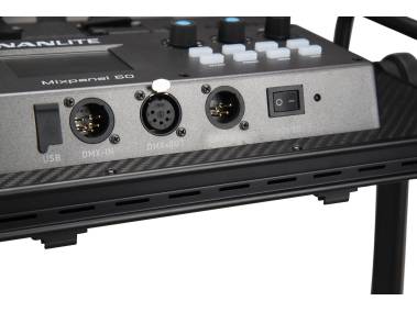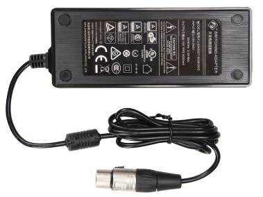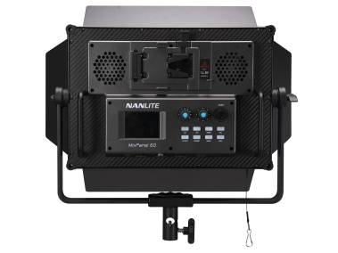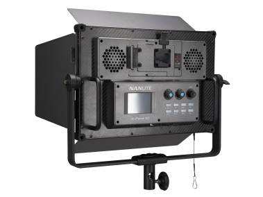 Stromversorgung über mitgeliefertes Netzteil. Befestigung über Netzteilhalterung im V-Mount-Anschluss an der Rückseite der Leuchte. Für den mobilen, netzunabhängigen Einsatz Betrieb mit V-Mount-Akku möglich (nicht im Lieferumfang).