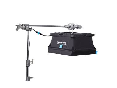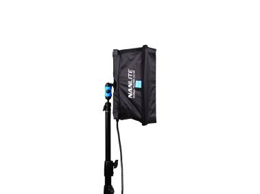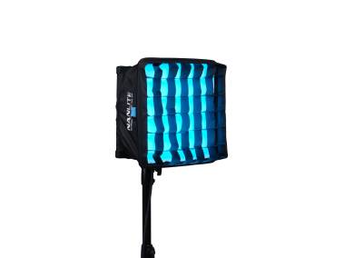 Patentierter Mechanismus zum schnellen Aufrichten der montierten Softbox und ebenso schnellem Zusammenfalten an den Außenseiten der Leuchte. So kann die Softbox auch bei Aufbewahrung der Leuchte im Transportkoffer montiert bleiben. Inkl. Standard- und Lite-Diffusor sowie abnehmbarer Stoffwabe.