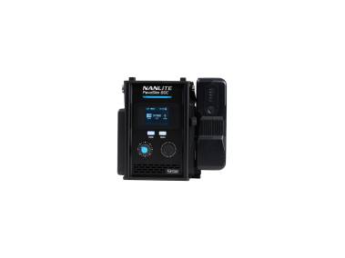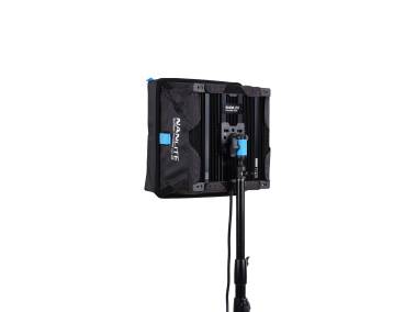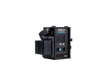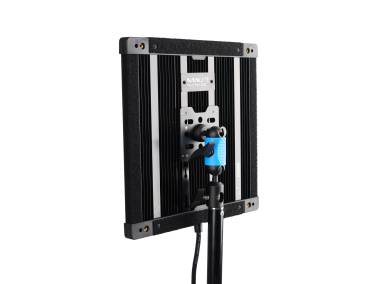 Separate Steuereinheit mit Bedienelementen und übersichtlichem 2,0“-Farb-Display sowie Anschlüssen für V-Mount-Akku und zwei NP-F-Akkus, DMX/RDM-Adapterkabel, usw. USB-Buchse für Firmware-Update. Tragegriff. Befestigung der Steuereinheit am Leuchtenstativ mittels mitgelieferter Stativklammer mit Schnellkupplung. 4,50 m-Netzkabel.