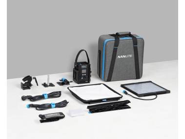 Lieferumfang: Flächenleuchte, separate Steuereinheit, Verbindungskabel (2,60 m), Netzkabel (4,50 m), Stativklammer, Softbox SB-PS-60Q (3990), Leuchtenhalterungen und Transportkoffer.