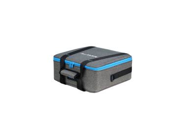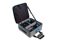 Gepolsterter Transportkoffer mit herausnehmbaren Trennelementen, Fach für die Leuchte innen im Deckel, Tragegriff sowie Umhängegurt mit Schulterauflage und Rutschsicherung.