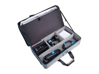 Lieferumfang: Flächenleuchte, separate Steuereinheit, Verbindungskabel (2,60 m), Netzkabel (4,50 m), Stativklammer, Softbox SB-PS-120Q (3991), Leuchtenhalterungen und Transportkoffer.