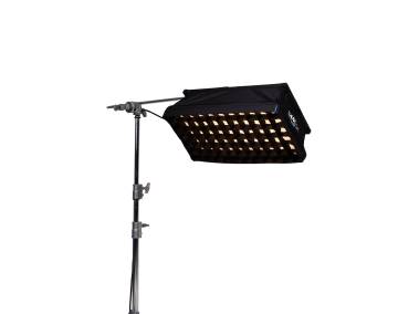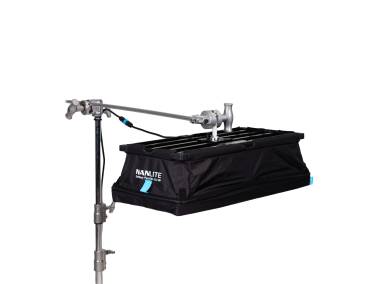 Patentierter Mechanismus zum schnellen Aufrichten der montierten Softbox und ebenso schnellem Zusammenfalten an den Außenseiten der Leuchte. So kann die Softbox auch bei Aufbewahrung der Leuchte im Transportkoffer montiert bleiben. Inkl. Standard- und Lite-Diffusor sowie abnehmbarer Stoffwabe.