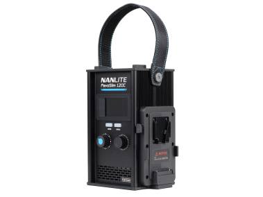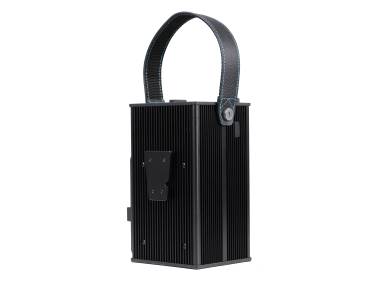 Akkubetrieb für den mobilen Einsatz mit einem V-Mount-Akku 14,4 – 14,8 V oder 26 V (jeweils optionales Zubehör). Befestigung an der Steuereinheit. Betriebsdauer bei 100 % Helligkeit