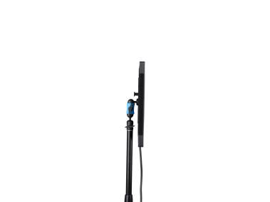 Separate Steuereinheit mit Bedienelementen und übersichtlichem 2,0“-Farb-Display sowie Anschlüssen für V-Mount-Akku, DMX/RDM-Adapterkabel, 24 V DC, usw. USB-Buchse für Firmware-Update. Tragegriff. Befestigung der Steuereinheit am Leuchtenstativ mittels mitgelieferter Stativklammer mit Schnellkupplung. 4,50 m-Netzkabel.