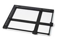 Metallgrundplatte mit rutschfester Unterlage und mattweißer Oberfläche. Verstellbarer Papieranschlag für Randbreiten von 5...12 mm. Metallklapprahmen mit Skalen in cm- und inch-Einteilung und selbsttätiger Papierklemmvorrichtung. Beidseitig geführte, selbstjustierende Maskenbänder mit Schnellklemmtasten. Maximal erreichbares Format 28 x 36 cm.
