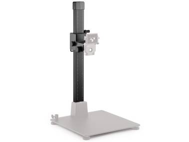 Breite und extrem vibrationsarme Führungssäule aus Aluminium-Profilrohr, mattschwarz eloxiert, mit cm- und inch-Skalen. Mit Haltearm und Befestigungsvorrichtung für Kameraarme und Gerätekopfunterteil 4568. Höhenverstellung mit Handkurbel.