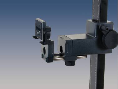70 mm breite, stabile und vibrationsarme Führungssäule aus mattschwarz eloxiertem Aluminium-Profil, mit cm- und inch-Skalen. Höhenverstellung des Kameraarms über kunststoffgelagerten Friktionstrieb mit Handkurbel. Gewichtsausgleich über mitlaufende Rollfeder.