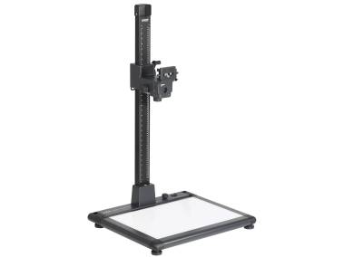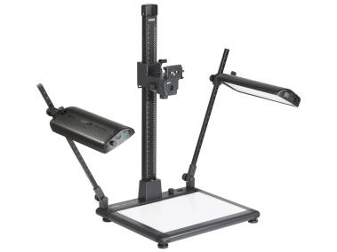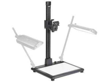 Reprostativ mit integrierter Durchlichteinheit. Leuchtgrundplatte mit 270 SMD-LEDs, 6000 Kelvin Tageslicht, Farbwiedergabeindex CRI = 95, nutzbare Leuchtfläche 50,6 x 36 cm (> DIN A3+), Leuchtdichte ca. 8300 cd/m², Helligkeit stufenlos regelbar, flimmerfreier Betrieb. Montagevorbereitung für optionale Auflichtbeleuchtungen RB 5270 DX (5278) und RB 525 AS (5284). Höhenverstellbare Füße. Wasserwaage im Sockel.