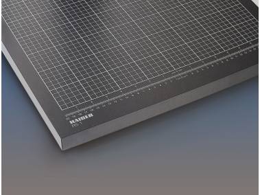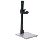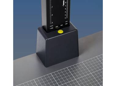 Reflexfreies, mattgrau beschichtetes "Grundbrett mit aufgedrucktem Feinraster, cm- und inch-Skala. Höhenverstellbare Füße. Wasserwaage im Sockel. Besonders breite und extrem vibrationsarme Führungssäule aus mattschwarz eloxiertem Aluminium-Profilrohr mit cm- und inch-Skala. Höhenverstellung durch kunststoffgelagerten Friktionstrieb mit Handkurbel. Gewichtsausgleich über mitlaufende Rollfeder. Säule um 180° gedreht montierbar.