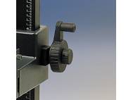 Wie Kameraständer RS 1 (5510), jedoch Höhenverstellung mit Handkurbel über Zahnstange mit zusätzlichem Gewichtsausgleich über eingebaute Rollfeder. Zusätzlicher Feintrieb mit Untersetzung 1:6 für besonders feinfühliges Verstellen. Blockierschraube zur Verhinderung eines unbeabsichtigten Verstellens der Höhenposition.