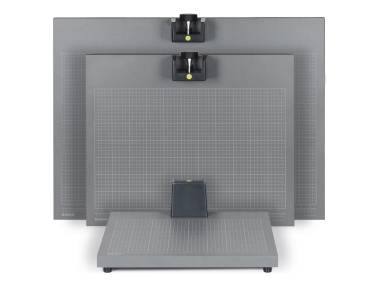 Mattgrau beschichtetes Grundbrett mit montiertem Sockel zur Befestigung der Führungssäule, aufgedrucktes Feinraster, cm- und inch-Skala. Wasserwaage im Sockel. Einzeln höhenverstellbare Füße.![]()