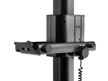 5603 Reprostativ RSD mot: Höhenverstellung des Kameraträgers motorisch mit zwei Geschwindigkeiten. Kabelfernbedienung. Konstante und belastungsunabhängige Verstellgeschwindigkeit. Automatische Endabschaltung über Magnetsensor. Netzteil mit beleuchtetem Schalter.