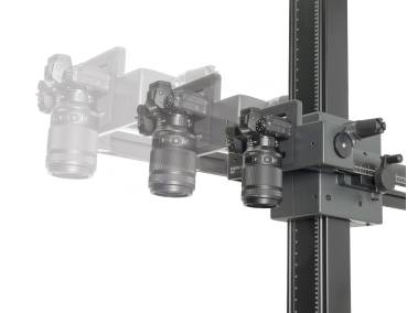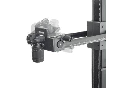 Kameraträger aus Aluminiumguss, horizontal verstellbar über neu entwickelte Parallelführung mit Zahnstange und Handkurbeln für Rechts/Links-Bedienung. Position fixierbar. Kamera-Montageplatte mit präziser Feineinstellung um +/- 90° schwenkbar. Eingebaute Wasserwaage.![]()