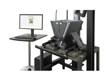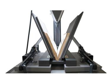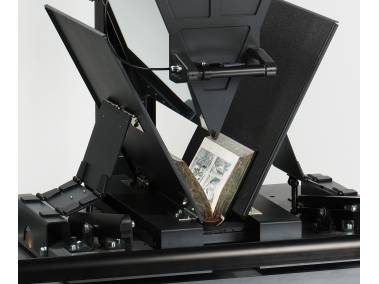 Vorrichtung zur Retrodigitalisierung von empfindlichen historischen Büchern und Dokumenten mit kritischem Erhaltungszustand, insbesondere für Bücher, die sich nicht weiter als 45° öffnen lassen. Alle Verfahrwege erfolgen manuell zur maximalen Buchschonung.