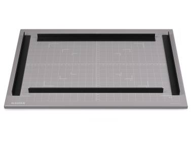 Metallgrundplatte mit rutschfester Unterlage. Oberfläche in mattgrauer Lackierung mit 18%-Reflexion zur Belichtungsermittlung. Aufgedrucktes Linienraster mit cm-Skalen und DlN-Formatmarkierungen. Wandmontage möglich.