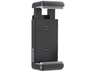 Gummierte Schnellklemme mit Spannweite 55 – 90 mm. Eine Klemmbacke mit Aussparung für Bedientaste. Drei Stativgewinde 1/4" für universelle Anwendung: Hoch- und Querformat, Foto-/Video-Aufnahmen und -Betrachtung, Videotelefonie und Smartphone-Bedienung.