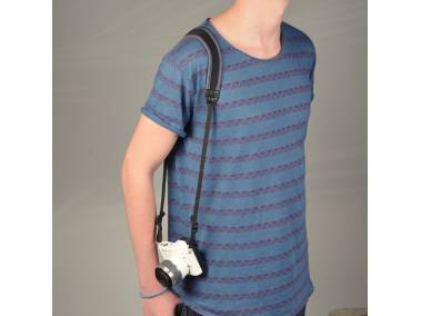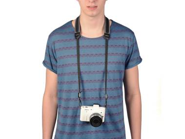 Bei Befestigung an Kompaktkameras lässt sich der Gurt über Schnellverschlüsse problemlos von der Kamera abnehmen.