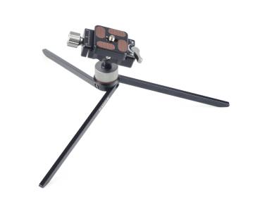 Elegantes, „dreiflügeliges“ Tischstativ aus hochwertiger, besonders leichter Aluminiumlegierung, schwarz eloxiert.