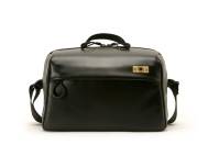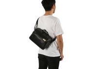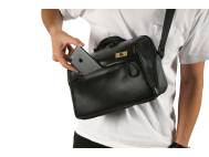 Fronttasche mit verdecktem Reißverschluss, hinten Einsteckfach mit Druckknopfverschluss. Breiter verstellbarer Schultergurt. Tragegriff.