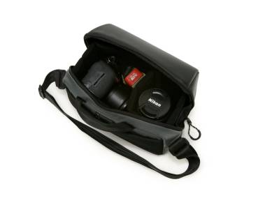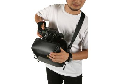Sling-Tasche für z.B. eine Kamera mit ein bis zwei weiteren Objektiven und Zubehör.