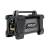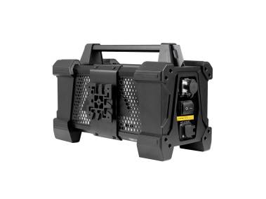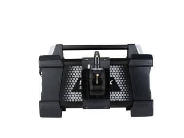 Robustes Aluminiumgehäuse mit Schwenk-/Tragegriff, seitlich mit Carbon-Optik.