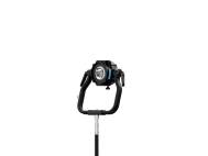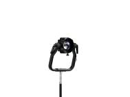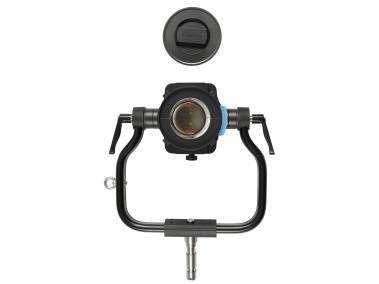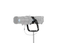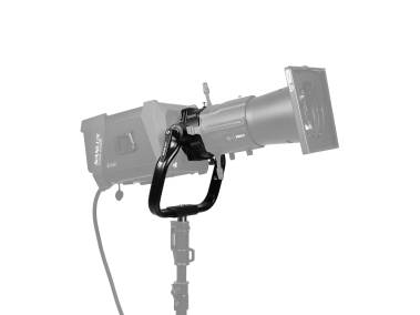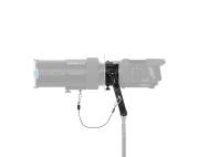 Speziell geformter Montagebügel, zur Verlagerung des Schwerpunktes bei montiertem Scheinwerfer und für einen größeren Schwenkbereich nach unten bei Montage auf einem Stativ. Verriegelung beidseitig mit Klemmhebeln. Aluminium. Befestigung auf geeigneten Stativen und an Halterungen mit 16 mm (5/8“)-Normzapfen (Baby Pin) oder 28 mm-Normhülse (Junior Pin).