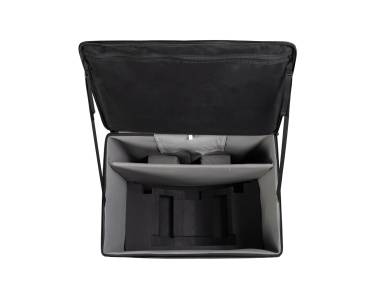 In robustem Transportkoffer (Trolley): 77,5 x 69 x 54 cm, 16 kg. Mit Formeinsatz, herausziehbarem Griff und Rollen.
