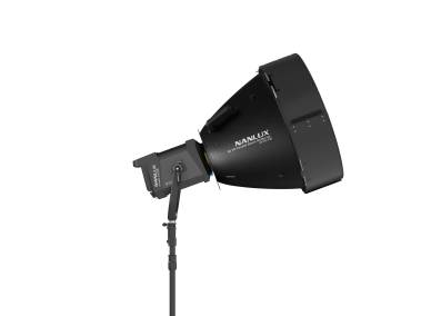 Der Verlängerungstubus (Snoot) vorne am Reflektor besteht aus vier biegbaren, leichten und strapazierfähigen Carbon-Platten, die an ihren Schmalseiten über Klettverschluss verbunden werden. Zur kompakteren Aufbewahrung können diese Platten über Scharniere nach hinten weggeklappt werden.