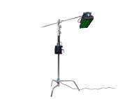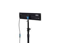 Separate Steuereinheit mit Bedienelementen und übersichtlichem 2,0“-Farb-Display sowie Anschlüssen für V-Mount-Akku und zwei NP-F-Akkus, DMX/RDM-Adapterkabel, usw. USB-Buchse für Firmware-Update. Tragegriff. Befestigung der Steuereinheit am Leuchtenstativ mittels mitgelieferter Stativklammer mit Schnellkupplung. 4,50 m-Netzkabel.