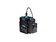 Akkubetrieb für den mobilen Einsatz mit einem V-Mount-Akku 14,4 – 14,8 V oder 26 V oder zwei NP-F-Akkus (Akkus optionales Zubehör). Befestigung an der Steuereinheit. Betriebsdauer bei 100 % Helligkeit