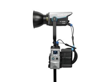 (Bei Netzbetrieb wird das Netzteil des Scheinwerfers an die Steuereinheit angeschlossen. Bei Akkubetrieb ist die max. mögliche Leistung des Scheinwerfers abhängig von der Anzahl und vom Typ der verwendeten Akkus. Beispielsweise werden bei FC-500B/C für volle Leistung zwei Akkus 26 V benötigt, bei Verwendung von nur einem Akku 14,4–14,8 V beträgt die max. mögliche Leistung 30 %.)