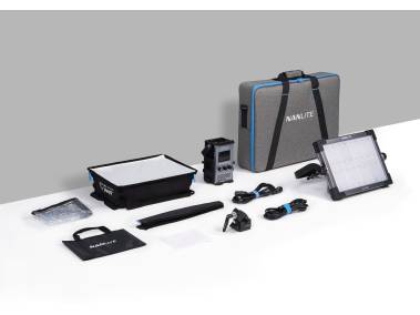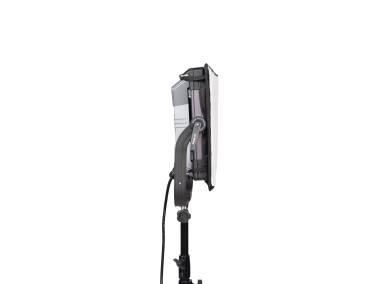 Lieferumfang: Flächenleuchte, separate Steuereinheit, Verbindungskabel (3 m), Netzkabel (6 m), Softbox mit Standard- und Lite-Diffusor sowie Stoffwabe, Stativklammer und Regenabdeckung für Steuereinheit, Transportkoffer.