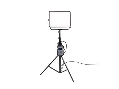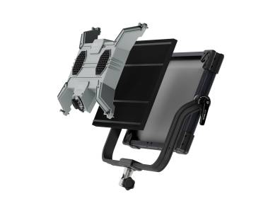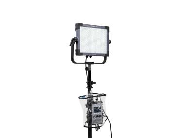Anschlüsse für zwei V-Mount-Akkus, DMX-IN und DMX-OUT, 48 V DC, usw. USB-Buchse für Firmware-Update. Tragegriff. Befestigung der Steuereinheit am Leuchtenstativ mittels mitgelieferter Stativklammer mit Schnellkupplung. Inkl. Regenabdeckung für die Steuereinheit.