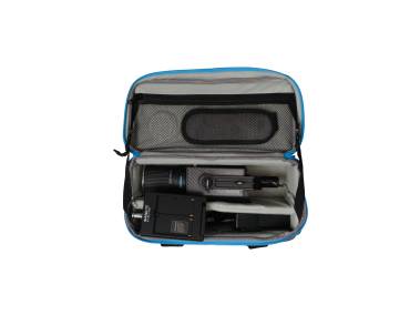 Gepolsterter Tragekoffer: mit herausnehmbaren Trennelementen, Netztasche innen im Deckel, Umhängegurt, Schulterauflage mit Rutschsicherung, Tragegriff sowie Stativhalteschlaufen auf dem Deckel.