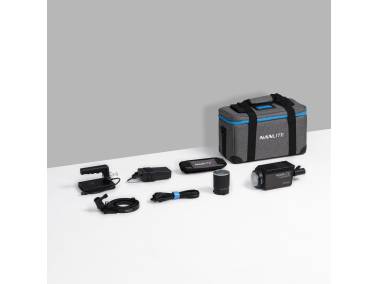 Lieferumfang: Scheinwerfer, Reflektor, Netzteil, Akku-Handgriff BT-BG-FZ60 (3901), Bowens-Adapter AS-BA-FMM und Tragekoffer.