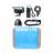 Robustes Kunststoffgehäuse, schwarz/silbern mit blauen Dekorelementen und Schwenk-/Tragegriff.