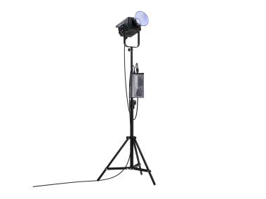 Lieferumfang: Scheinwerfer, Reflektor, Netzteil, Netzkabel (6 m), Verbindungskabel (3 m), Stativklammer und Tragekoffer.