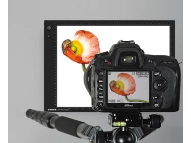 Uniform and color precise illumination for viewing, sorting and photographic capturing (digitizing) of slides or other transparent originals.