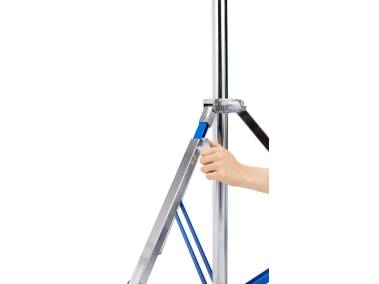 3-section, telescopic center column, with spring cushion. One leg can be leveled.