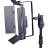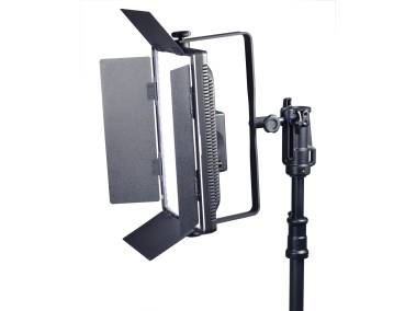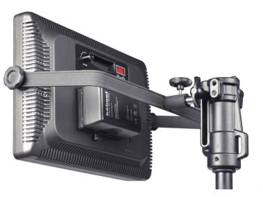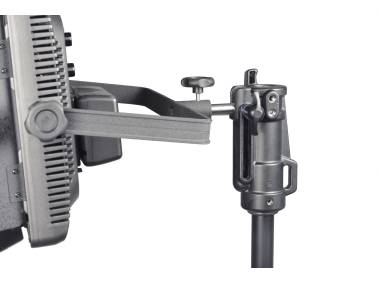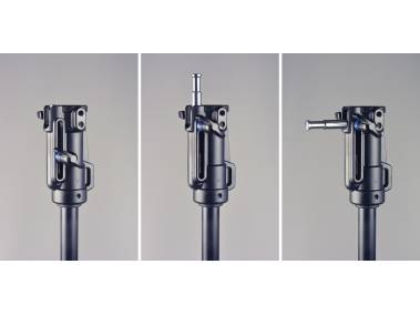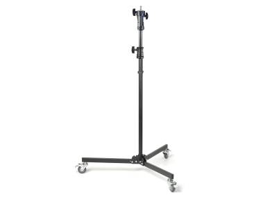 Mobile and extremely stable light stand. Folding legs with lockable pivoting rollers, one leg can be leveled. Center column with spring cushioning.