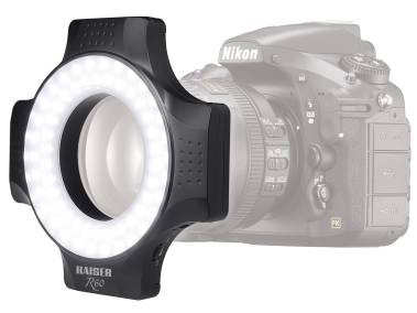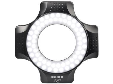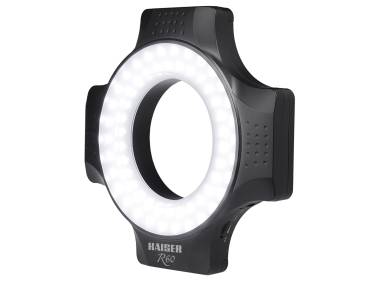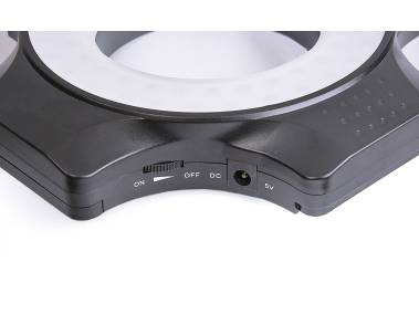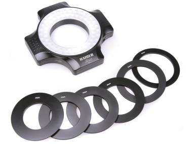 Powerful ring light for shadowless illumination in close-up photography. 60 daylight LEDs (colour temperature approx. 5600 K). Illumination approx. 2400 lux at 30 cm (1 foot) distance and 50° angle of radiation. Continuously dimmable.