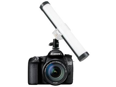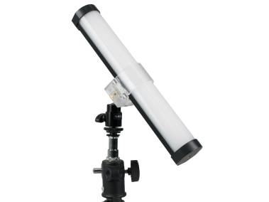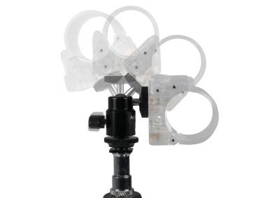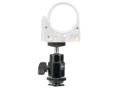 Transparent pipe clamp with clip lock, on ball head with mounting foot. For variable mounting of a PavoTube II 6C RGBWW tube light (3708) into the accessory shoe of a camera or on stands and fixtures with 1/4“ connection thread.